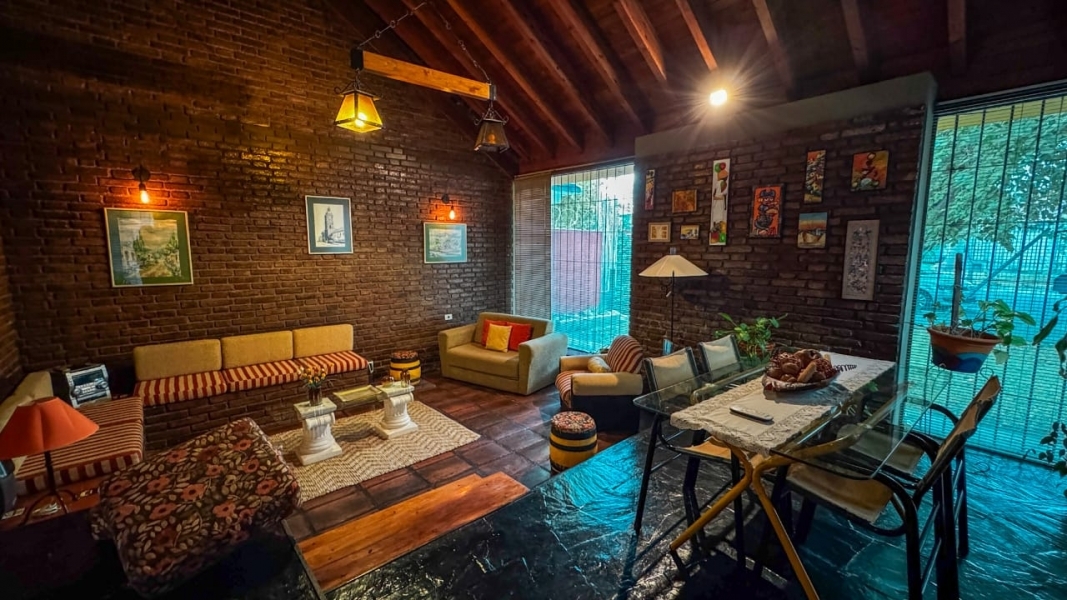 La casa se desarrolla en dos plantas. En planta baja encontramos un amplio living comedor en desnivel. Cocina con bajo mesadas y alacenas. Comedor de diario con vistas al patio. Baño de visitas. Cochera cubierta para 2 autos. Amplio patio parquizado con galería. Jardín.