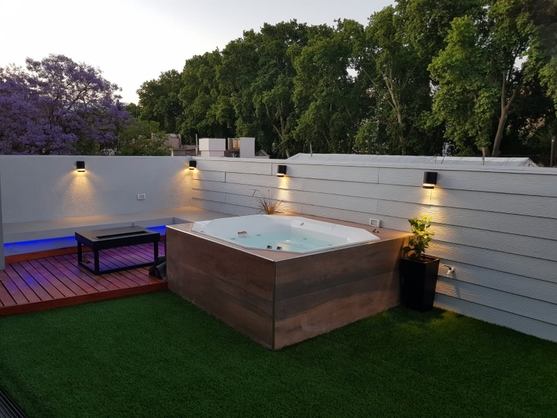 Terraza: 45 metros semicubiertos. Baño completo. Importante parrilla con bacha y mesada. Jacuzzi exterior. Ducha exterior.