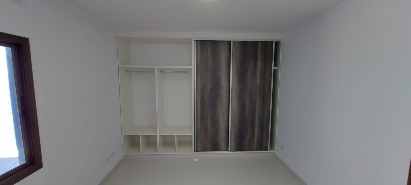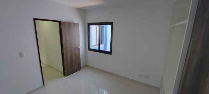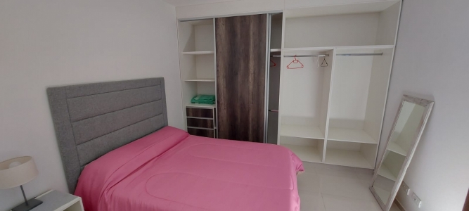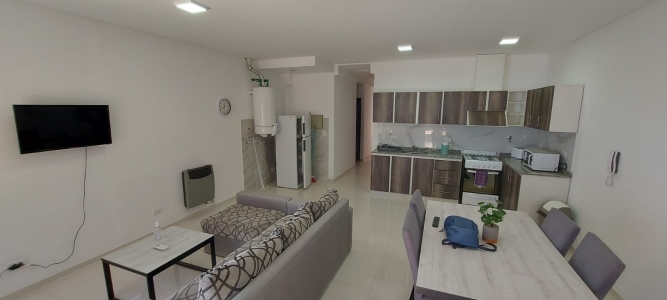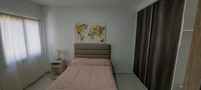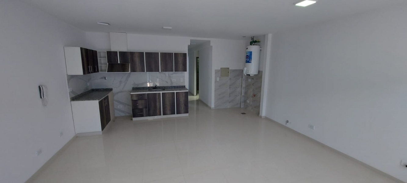 Un departamento de un dormitorio con placar, Cuenta con living comedor con cocina y lavandería. Un baño zonificado